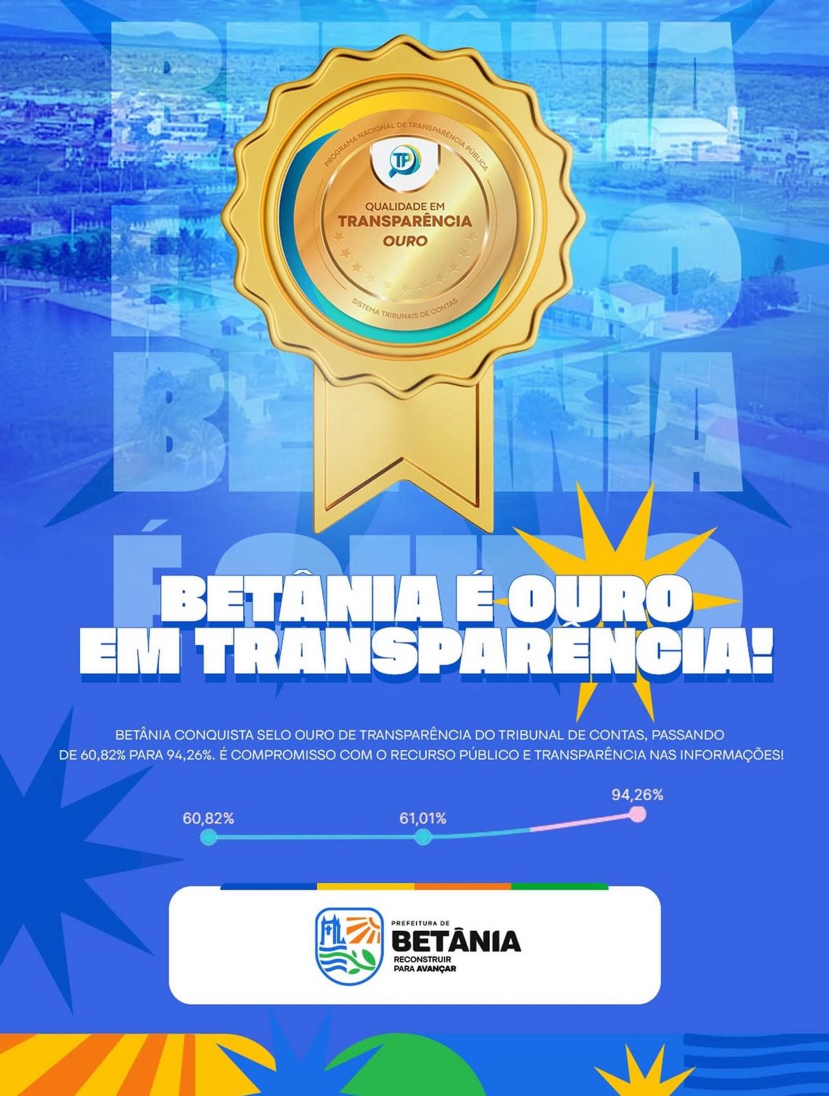A Prefeitura de Betânia alcançou, pela primeira vez em sua história, a Medalha Ouro na avaliação do Portal da Transparência, marcando um avanço inédito na gestão pública do município. O resultado representa um salto significativo na qualidade das informações disponibilizadas à população, com a nota passando de 60,82% para expressivos 94,26%. A conquista simboliza um