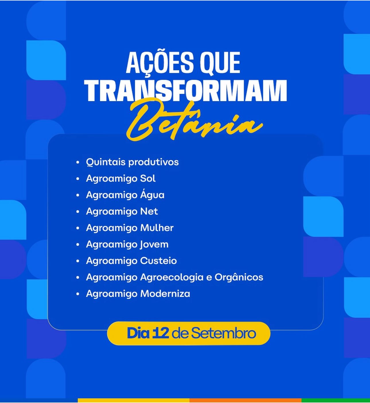 Ações que Transformam Betânia oferecem atendimento e serviços à população nesta sexta-feira (12)A Prefeitura de Betânia realiza, nesta sexta-feira, 12 de setembro, mais uma edição do programa “Ações que Transformam Betânia”, uma iniciativa que busca aproximar os serviços públicos da população e promover soluções práticas para o dia a dia dos cidadãos. O evento acontecerá em frente à sede da Prefeitura, a partir das 9h, e oferecerá por Ascom, publicado em 12/09/2025 10h38, última modificação em 29/10/2025 10h40